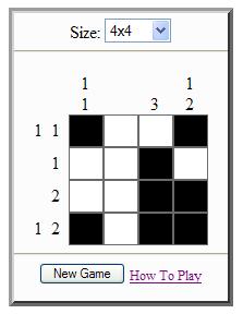 This game is based on a PC game by Simon Tatham (called "Pattern"), who himself based his game on a different games called "Nonograms". The object of the game is to fill in the entire grid with black or white squares. The game has various grid sizes from 3x3 to 12x12. All puzzles are randomly generated.