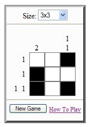 This game is based on a PC game by Simon Tatham (called "Pattern"), who himself based his game on a different games called "Nonograms". The object of the game is to fill in the entire grid with black or white squares. The game has various grid sizes from 3x3 to 12x12. All puzzles are randomly generated.