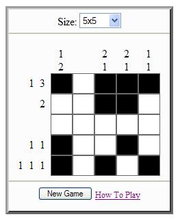 In order to win the game you must completely make every square on the grid either black or white AND have every row and column match the correct number, and lengths, of consecutive black squares. NOTE: There may be more than one way to solve the same puzzle.